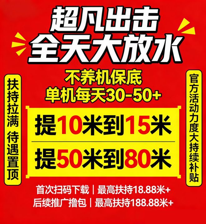 首码超凡出击是一个手机看广告赚钱的项目。新人扫码下载马上能拿到高额扶持,不用养机子也有保底收入,全天都在放福利。自己玩一天能赚30到50块,拉上朋友还能日入过百。平台送了免养机的教程,扶持给得特别足,待遇算是顶配了。