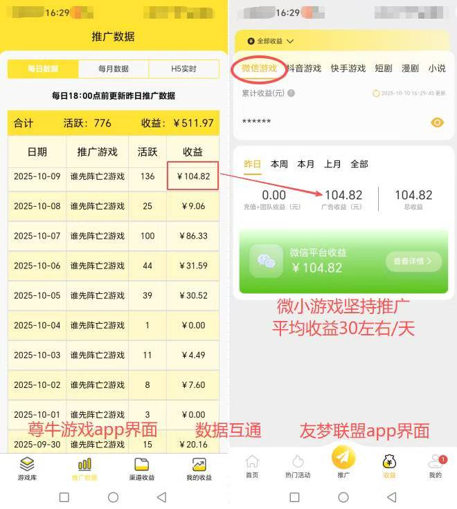 有梦联盟是一个全新的项目,通过分享小游戏来赚取收入。只需将平台上的小游戏推荐给朋友,朋友在玩游戏的过程中观看广告,你就能获得相应的收益。而如果你自己试玩并观看广告,也能赚到一些收益,不过相对较少。收益会在隔天晚上六点之前进行结算,确保你可以及时看到收益情况。熟悉这个玩法的人,每天都能有不错的收益,最高一天甚至能赚上百元。