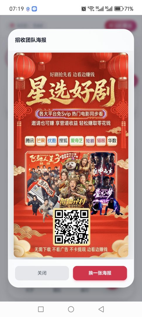用户在星选影视上每点击一次视频即可获得0.055元。简单操作:选择在线观看,点击立即播放后,通过打开浏览器自动跳转,再搜索播放视频即可计入收益。分享链接给好友可获得更多点击收益。这种五级管道式收益模式加上分佣和分红,轻松实现高额回报。