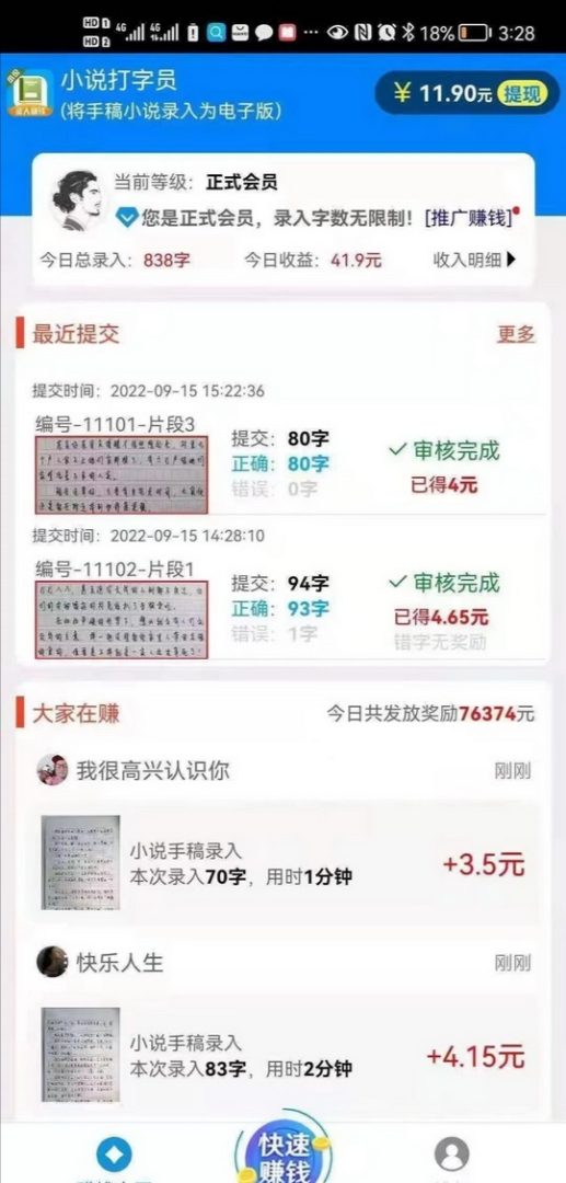 目前免费打字录入平台的收益比较稳定,录入的字数越多,收益越高,多劳多得的分配方式,而且不限制时间地点,有空闲时间都都能来录入赚钱,有数字、短篇小说、地址录入、订单号录入等数十种项目,完成录入一个1.5-3元之间,提米极速到账!