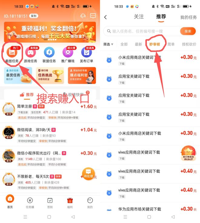 每天赚点提供搜索赚免审核任务,每个任务收益为0.3元。下载APP后,用户无需试玩,只需20秒即可完成,有倒计时提示,方便快捷。单靠这一板块每天可获取稳定收益。