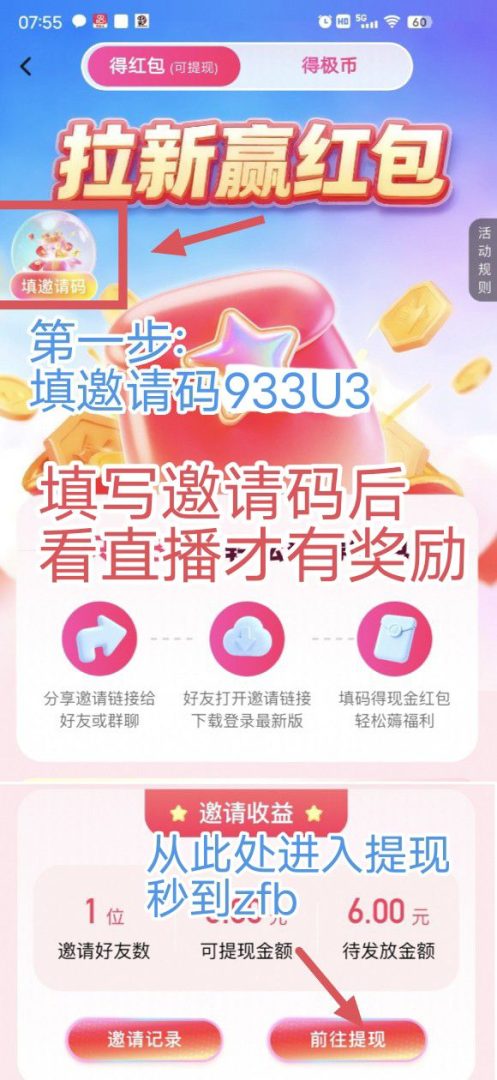 值得注意的是,收益需在48小时后才可提现。这一设定确保了平台的稳定与用户体验的流畅。填写邀请码后,即可通过看直播获取收益。极近为用户提供了一种轻松、稳定的赚钱方式,让每日看直播变得更有价值。