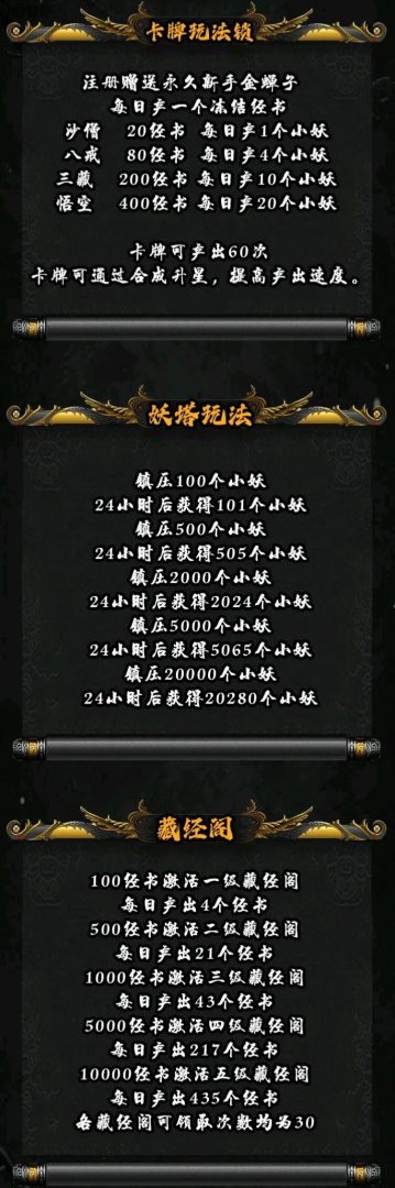 游戏中限量发售的卡片种类丰富。用户可选择沙僧卡、八戒卡、三藏卡或悟空卡,产生小妖进行转化。其中,每小妖能换取0.5本经书,快速提高收益。