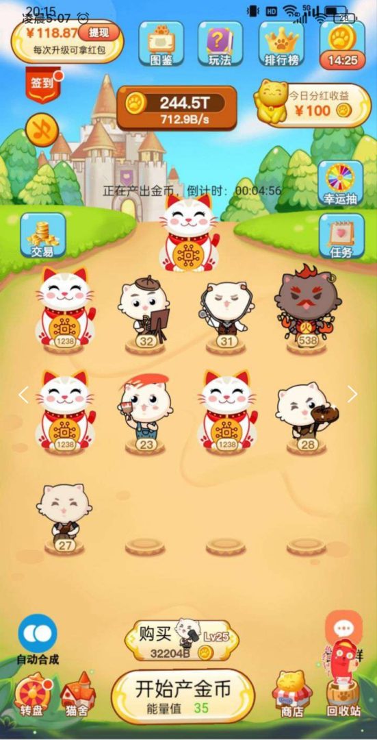 合成高等级猫咪可获得红包奖励,38级招财猫锁定永久分红,平台广告收入实时到账,支持余额极速提现至微信,玩家可以多号操作,确保稳定收益。