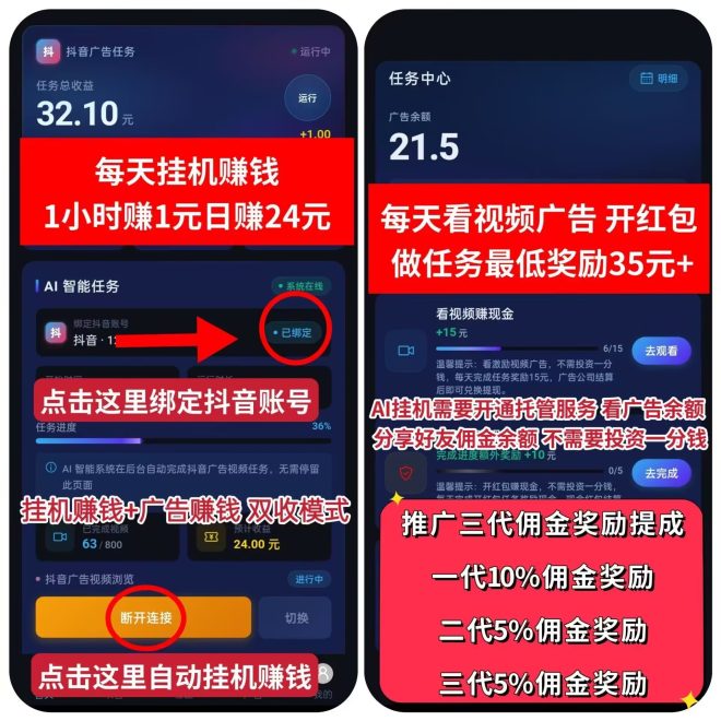 用户绑定抖音账号后,可开通托管服务实现账号24小时自动运行,平台按天结算收益,每月稳定收益720元,无需额外操作即可实现挂机赚钱。