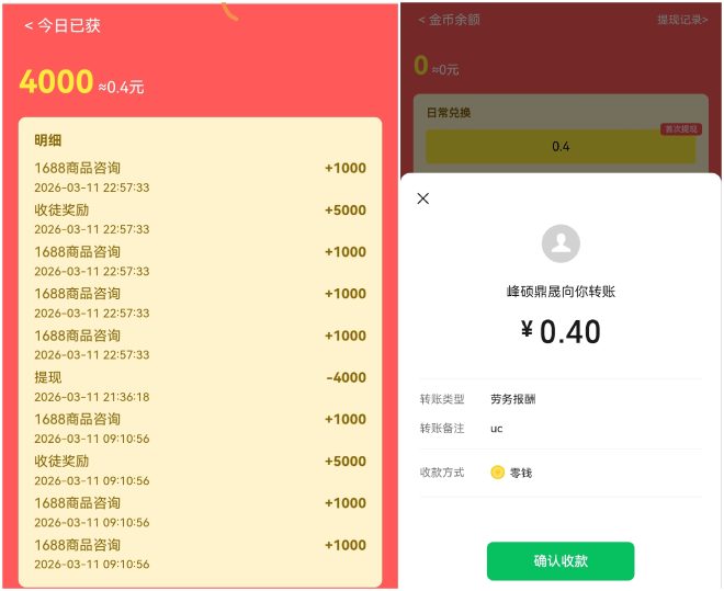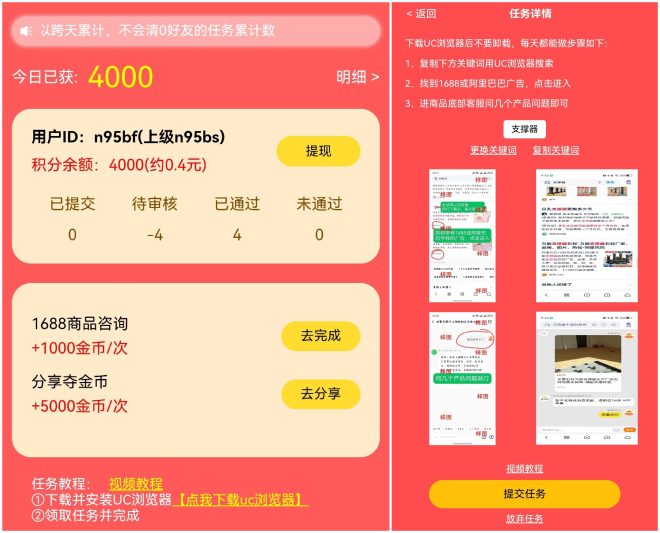 3、每天可以做4个任务,任务审核略慢,通过可以获得0.4元,邀请好友做完4个会有0.5元,适合多号操作!
