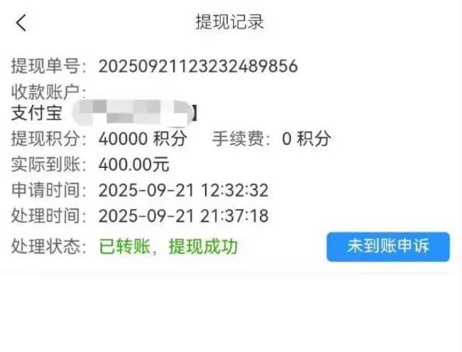 接着,我们可以等大概几分钟时间就能够审核完毕,那么就会有积分入账(只要注册短信是正确的,而且是新用户),然后首次10元后续20元起即可提现!
