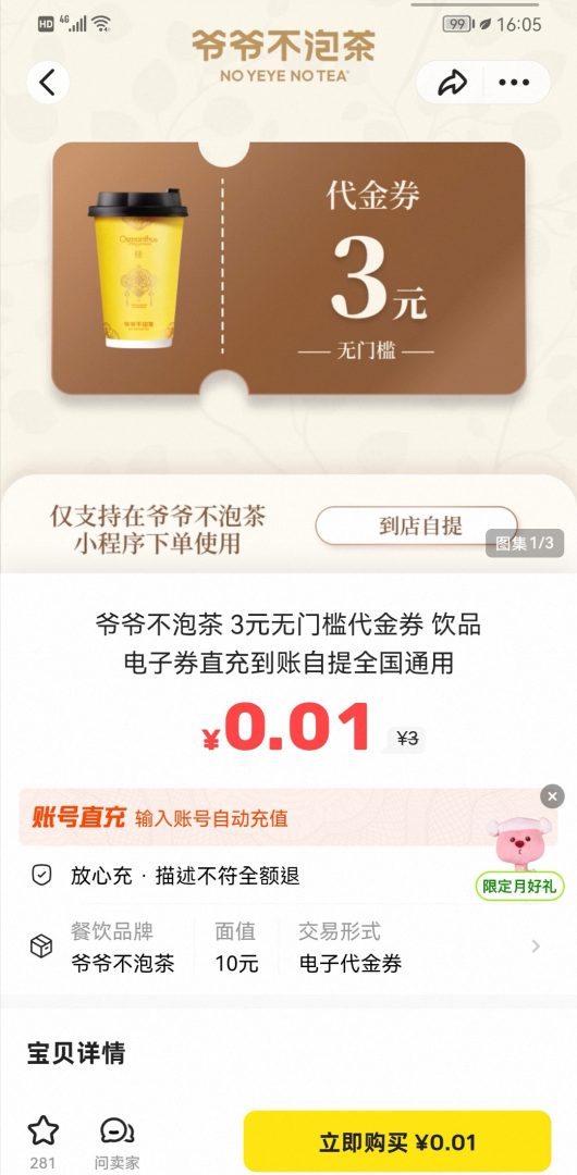 【闲鱼】https://m.tb.cn/h.iU13Iwt?tk=JDm7UyoQ03R CZ057 「爷爷不泡茶 3元无门槛代金券 饮品电子券直充到账自提全国通用」