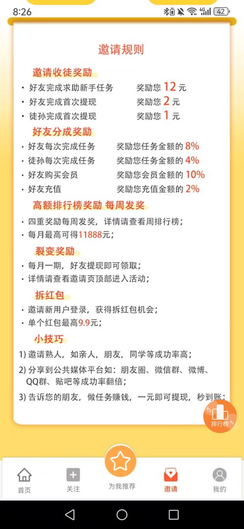 进入平台后,可通过点击每日擂台查看任务,关注平台推荐的大神们,再模仿他们的操作方法,任务完成效率更高。左下角的关注功能能快速找到适合的任务类型,只需跟随步骤完成即可轻松赚取收益。