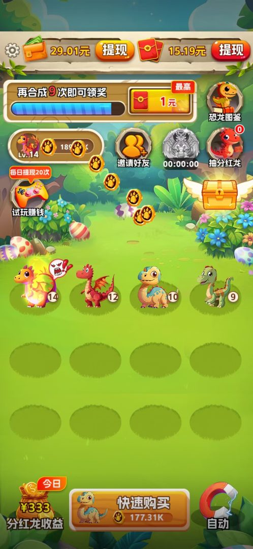 欢乐养龙是一款合成养成类休闲小游戏,玩家通过合成相同等级的龙蛋,孵化出更高等级的龙,从而获得收益。游戏操作简单易上手,提现支持秒到账,资金流动快。