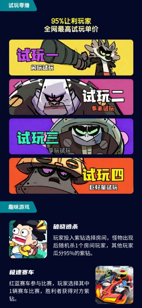 ③试玩和趣味游戏玩法,渠道收益更多,可玩性选择增多,喜欢那个玩那个