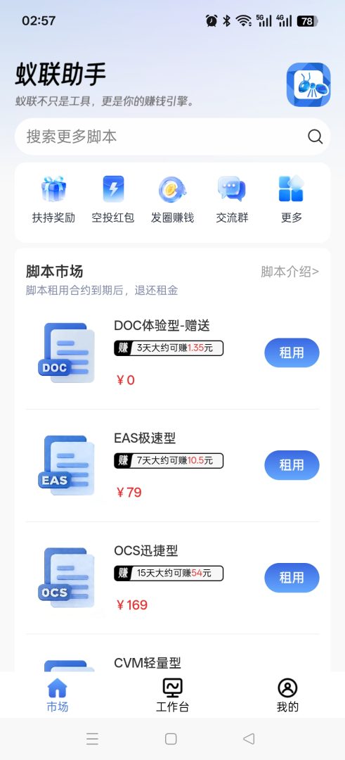 蚁联助手注册实名后首页直接领取0元矿机,每天签到一下就能赚收益,首页上方的发圈任务也可以顺手做一下,满0.5就能提现。