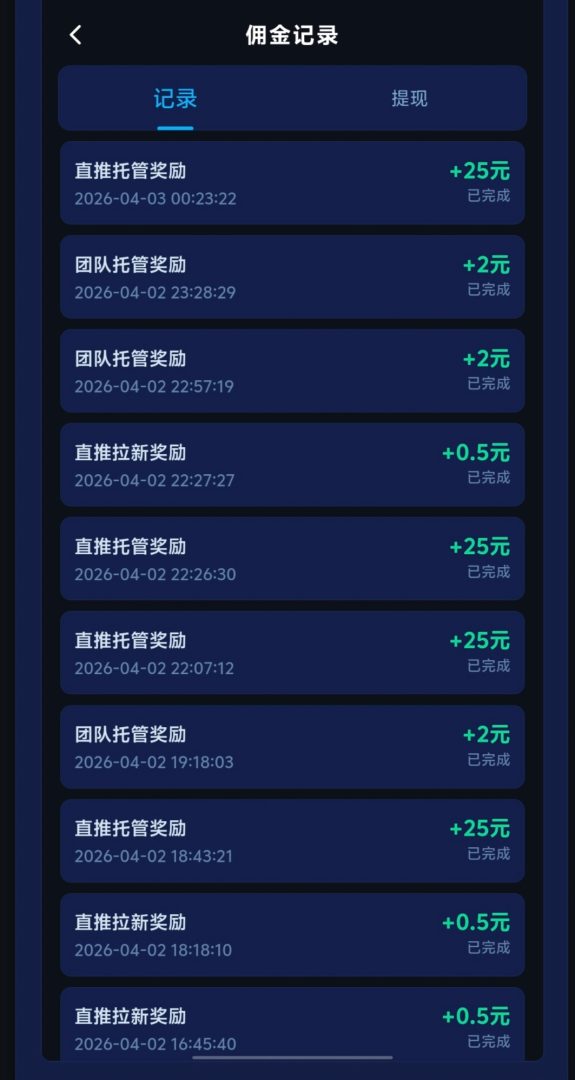 邀请好友注册可得0.2-1元奖励。下级挂机和广告收益都能抽成10%,团队收益再拿5%。推广越多被动收入越高,适合有人脉资源的用户。