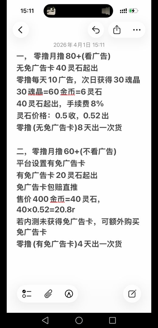 ①【零撸重点】新人注册并简单实名后可开启机甲,每天产41个魂晶,10魂晶锻造一次,可以获得20金币,一天也就是82金币,兑换成灵石是8个,一灵石0.5托底,日撸4米,