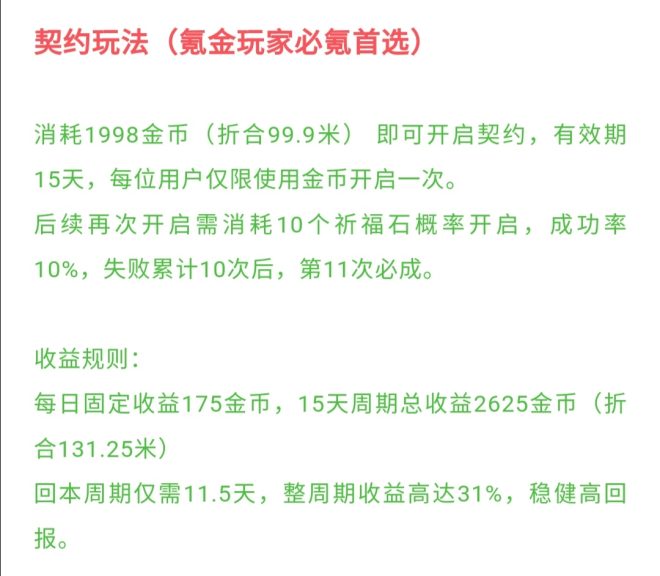 契约玩法是消耗1998金币开启,每人限一次,可大量赚取金币