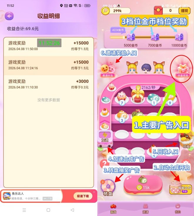 软件刚上线整体金币产出非常猛,点开智能合成功能系统就会自动给你弄高级甜品,甜品等级拉上去每天的收益跟着水涨船高,完全不用去搞什么养鸡模式直接转化拿钱。
