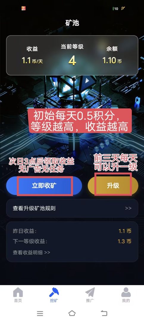 daily爬墙挖矿每天签到领积分,无广告无任务,每天签到即可领取积分,初级每天领取0.5积分,等级越高每天领取的收益越高,邀请收益一级30%二级25%。