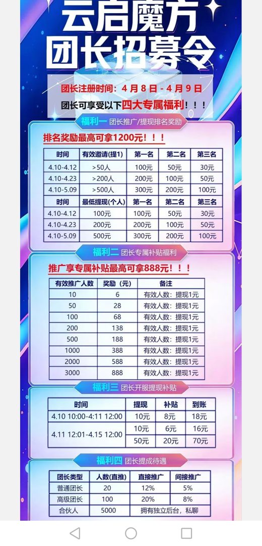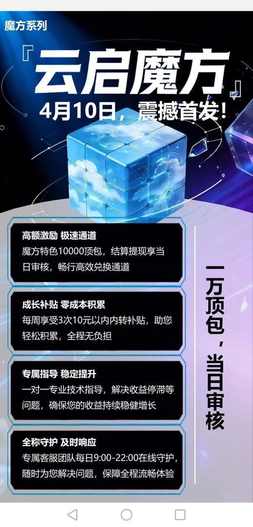 天启魔方系列首码上线,10号正式公测,目前内测中。红包悬浮球玩法,收益高,公测福利拉满,人人赚到手软,零撸广告,1米起提,秒到。