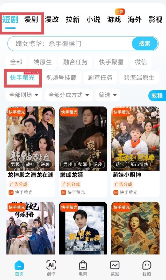 第一步:打开软件,选择短剧或者漫剧,选择KS萤光。