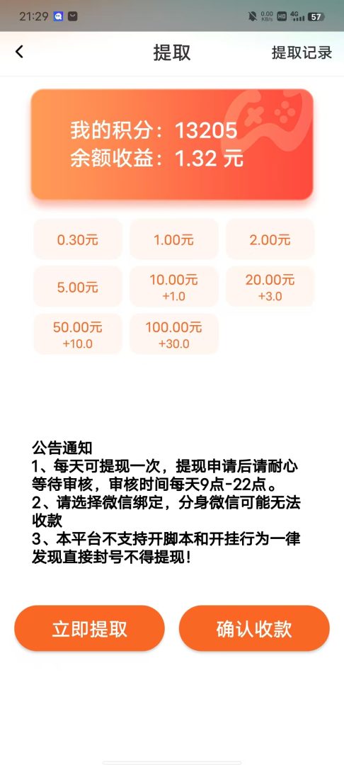 收益提取审核速度很快,基本上10分钟内审核,分为多档提取,客服晚上10点才下班,保证收益准时到/款