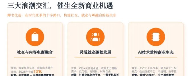 社交电商、灵活创业、AI 技术三大浪潮交汇,2026 年社交 + AI 融合电商规模将突破 5 万亿,超 2 亿灵活就业者,正迫切等待一个低门槛、高回报、时间自由的创富平台。 传统副业门槛高、收益低、模式枯燥、无法共享平台红利…… 普通人想增收,总是举步维艰。 蝉书优选由数来科技倾力打造,行业首创 AI 智能** + AI 视频带货双赋能,重新定义价值连接,打通创作者与用户闭环,让每一份贡献,都获得超值回报