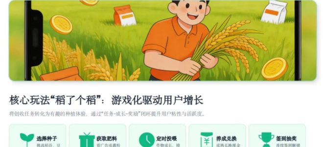 3. 游戏化激励独创「稻了个稻」玩法:选种子→赚肥料→养作物→兑奖励,把任务变游戏,娱乐中轻松赚收益。
