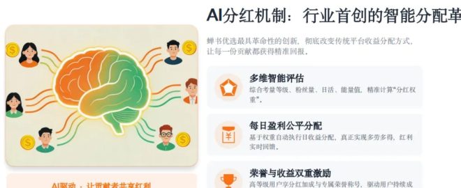 一、四大核心壁垒,颠覆传统副业 蝉书优选以AI 驱动、精准计算、共享红利、收益可观为核心,打造全民可参与的创收生态: