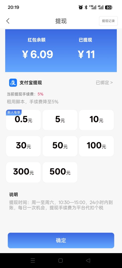 提现时间周一到周六每天10.00到15.00,小额度秒到账收益真实。