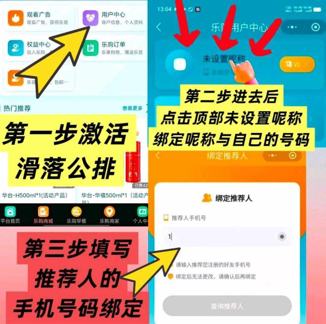 绑定推荐人号码填13543246902,微信扫码加入,如何绑定推荐人,点用户中心,昵称,手机号,保存修改,再绑定推荐人,绑定激活即进入公排后,再激活了钱包就有收益贡献。